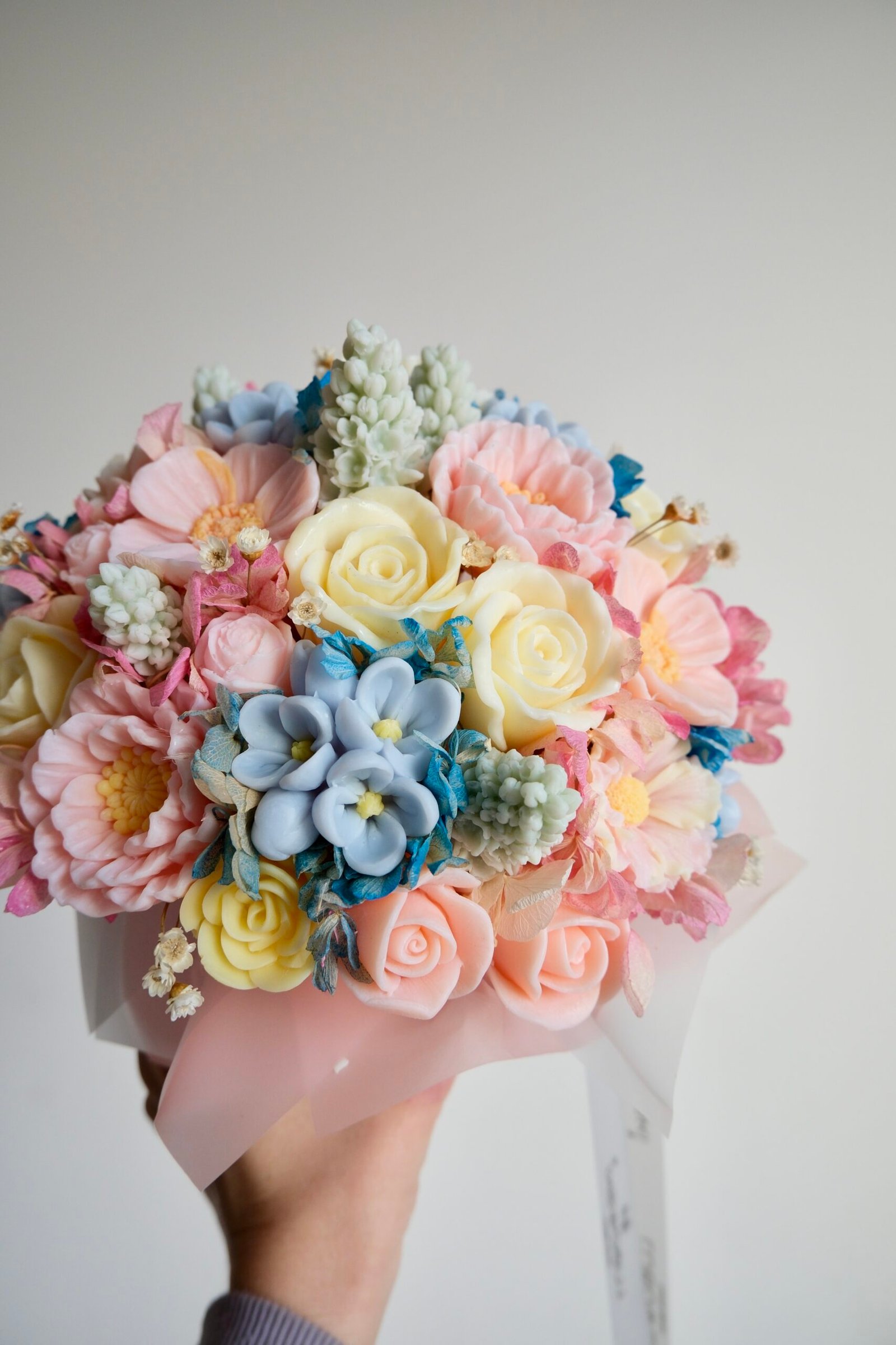 Pastelowa kompozycja kwiatowa ze świec sojowych w boxie