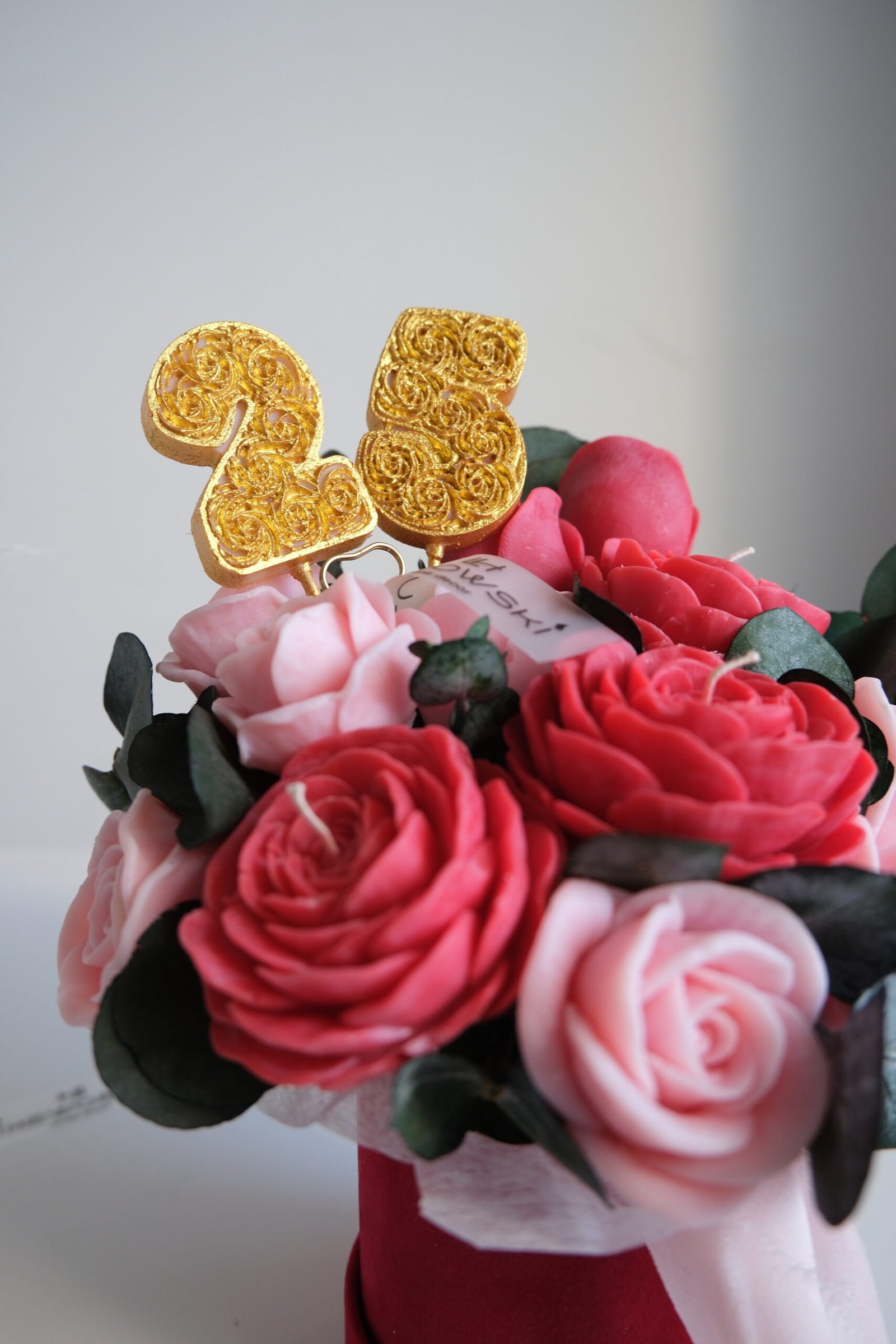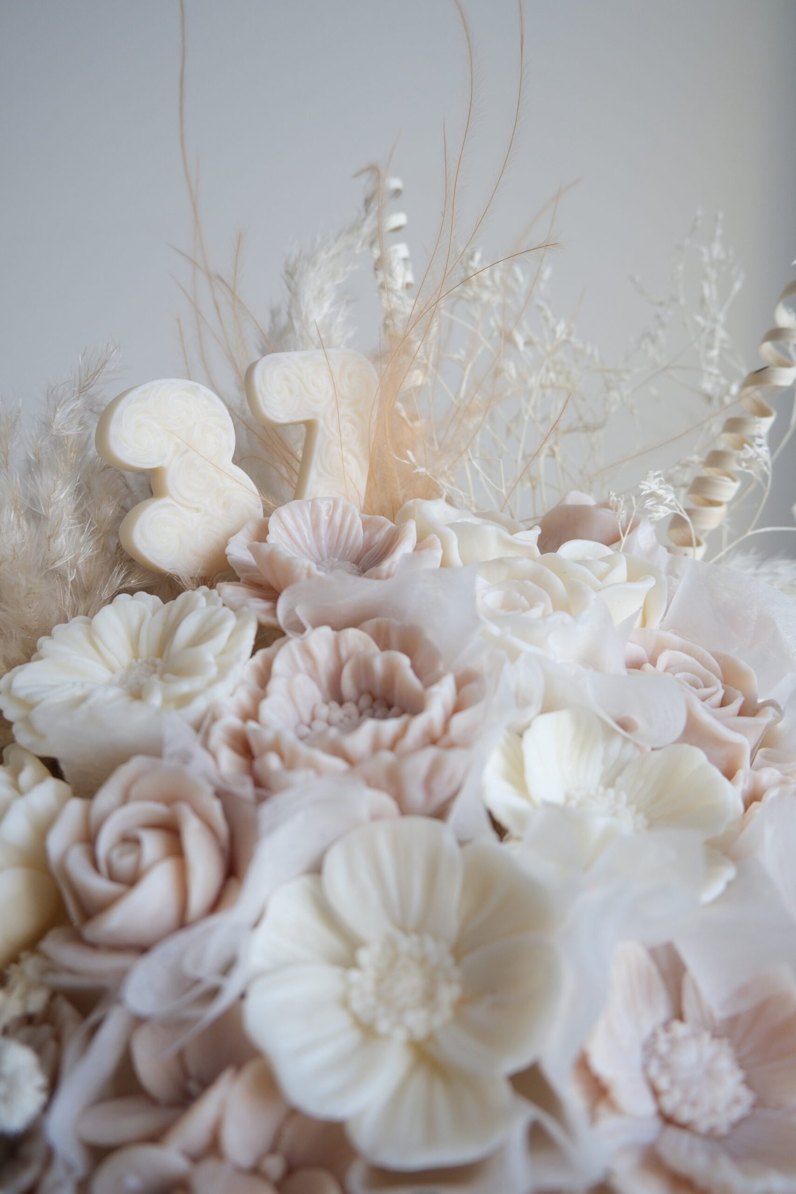 Nasze cyferki z wosku sojowego do flower boxów wykonywane są ręcznie z wysokiej jakości wosku. Dzięki temu nie tylko pięknie się prezentują, ale również wyróżniają się dopracowaniem detali. Każda cyfra stanowi elegancką ozdobę flower boxa, bukietu ze świec lub innej kompozycji prezentowej, dlatego doskonale wpisuje się w estetykę produktów premium. Co więcej, przyciąga uwagę i jednocześnie nadaje całości luksusowego charakteru.