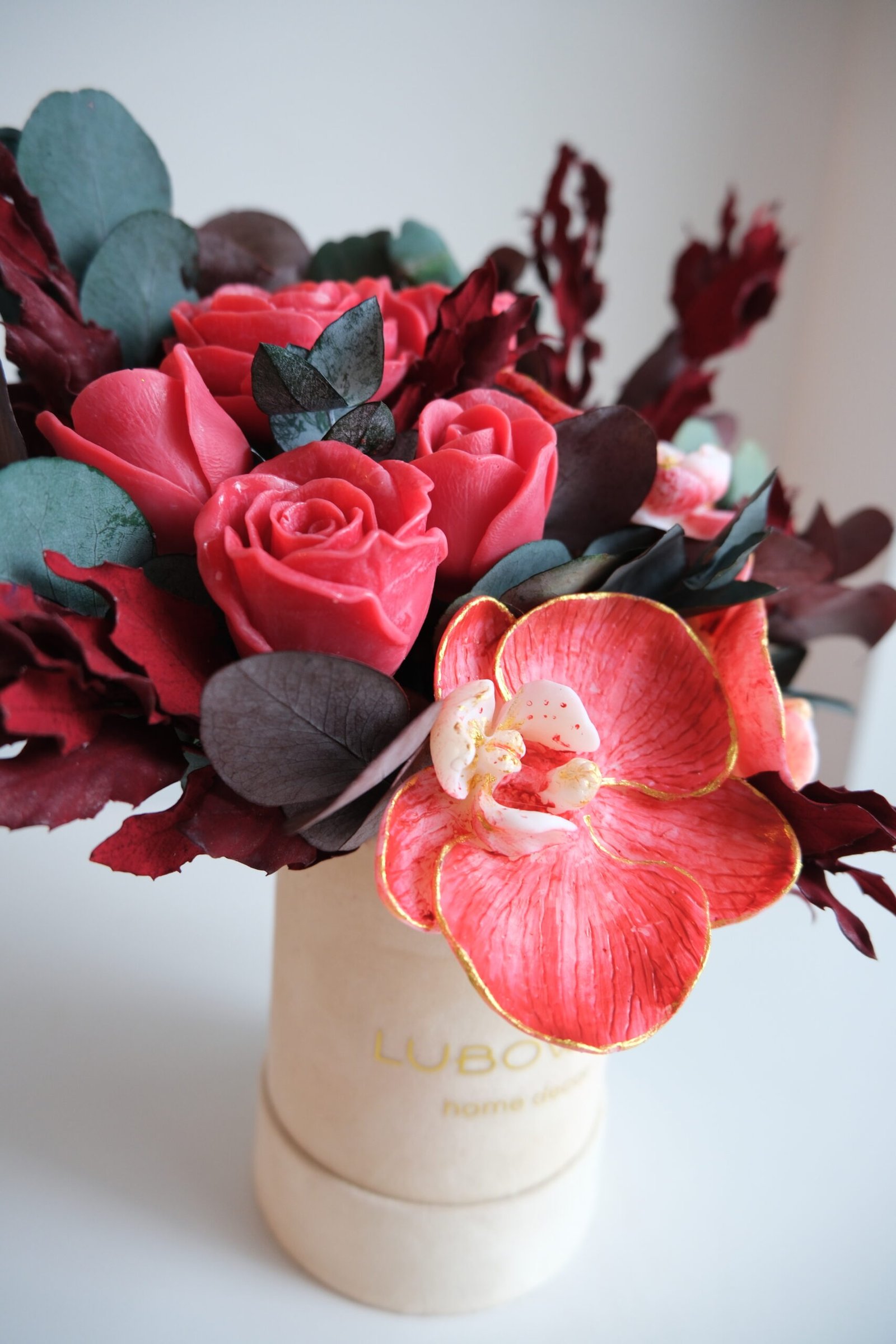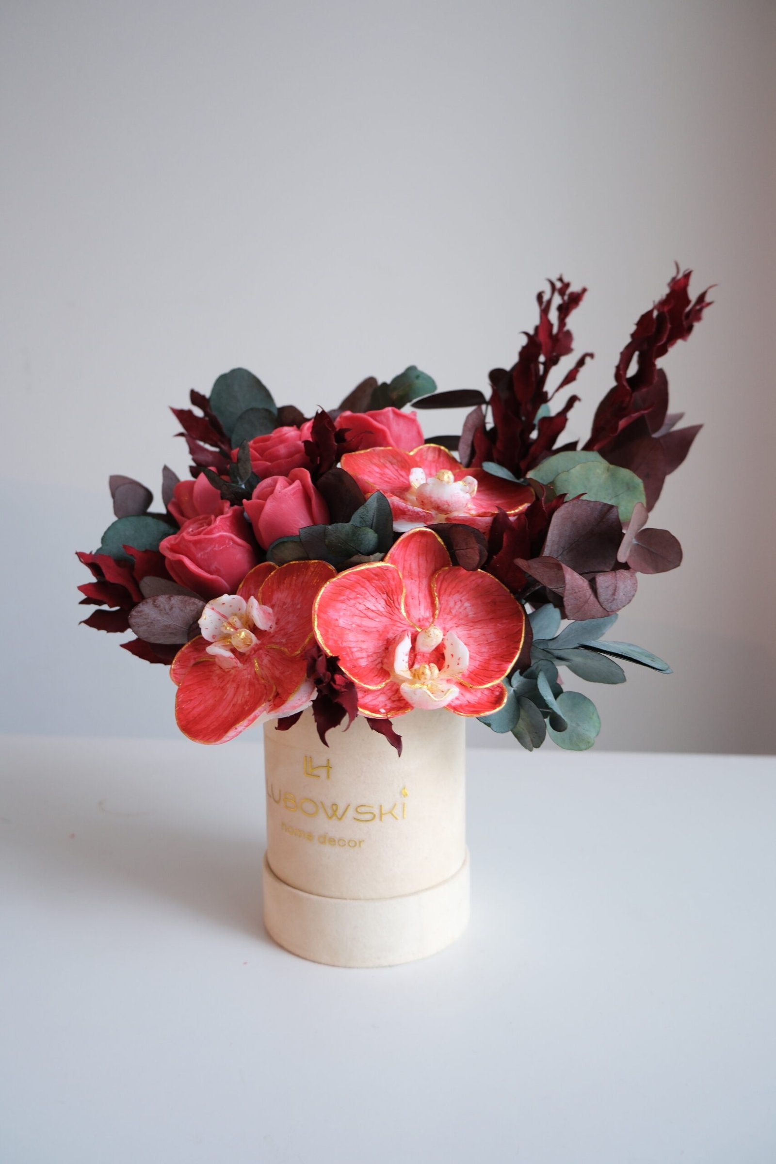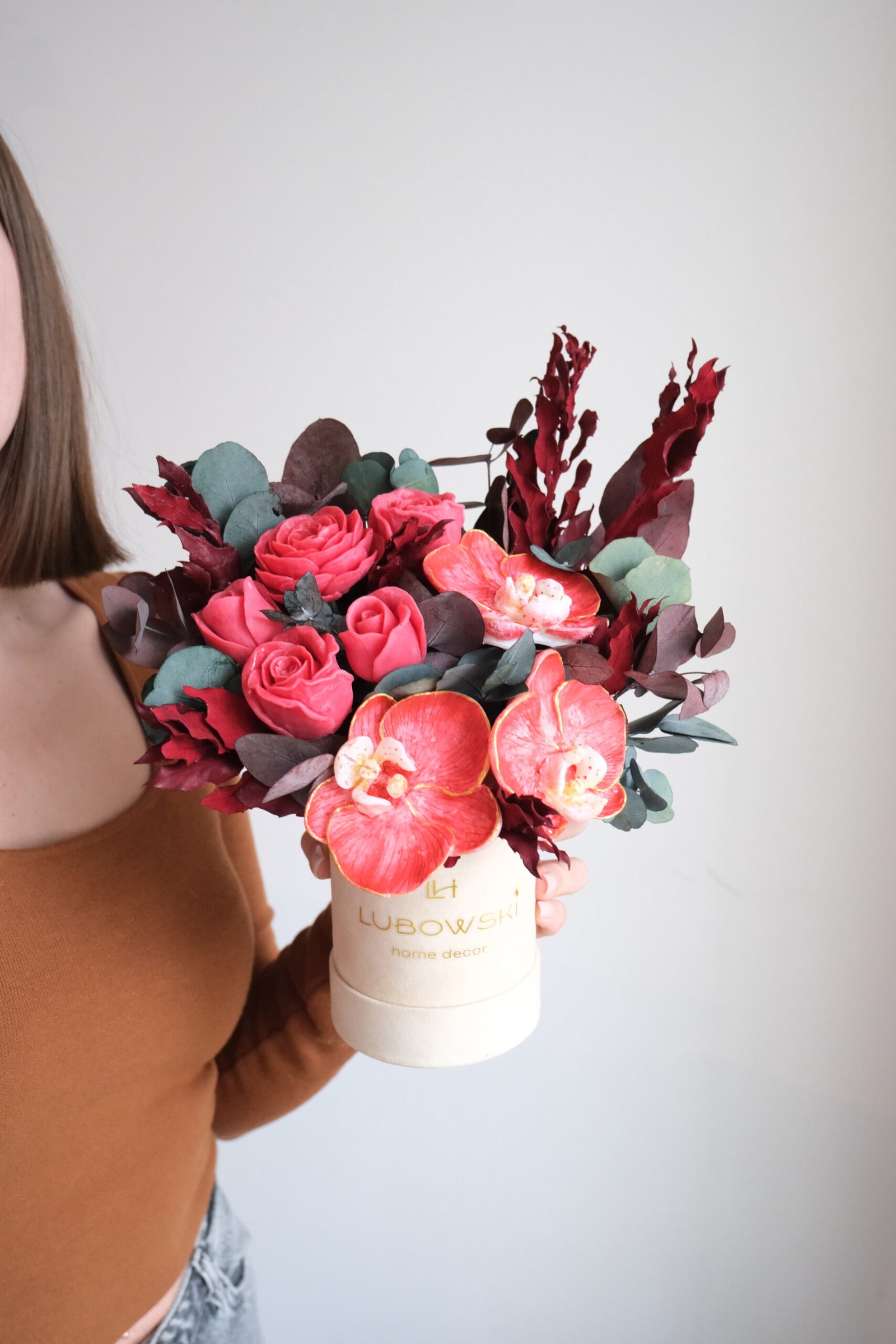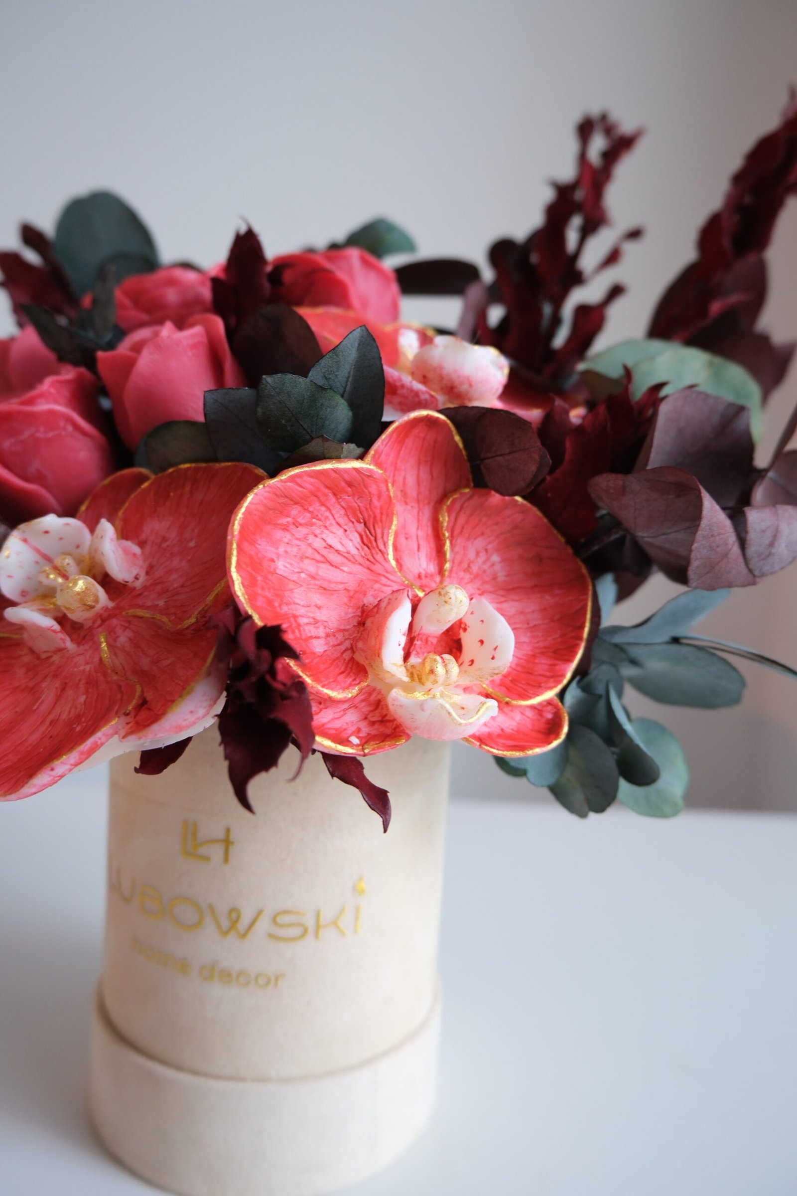 Świece wykonane są z naturalnego wosku sojowego, który pali się czysto i równomiernie. Centralnym elementem kompozycji są ręcznie malowane storczyki, które nadają całości luksusowego, artystycznego charakteru. Dodatkowo stabilizowany eukaliptus oraz stabilizowane trawy sprawiają, że flower box zachowuje świeży wygląd bez potrzeby pielęgnacji.