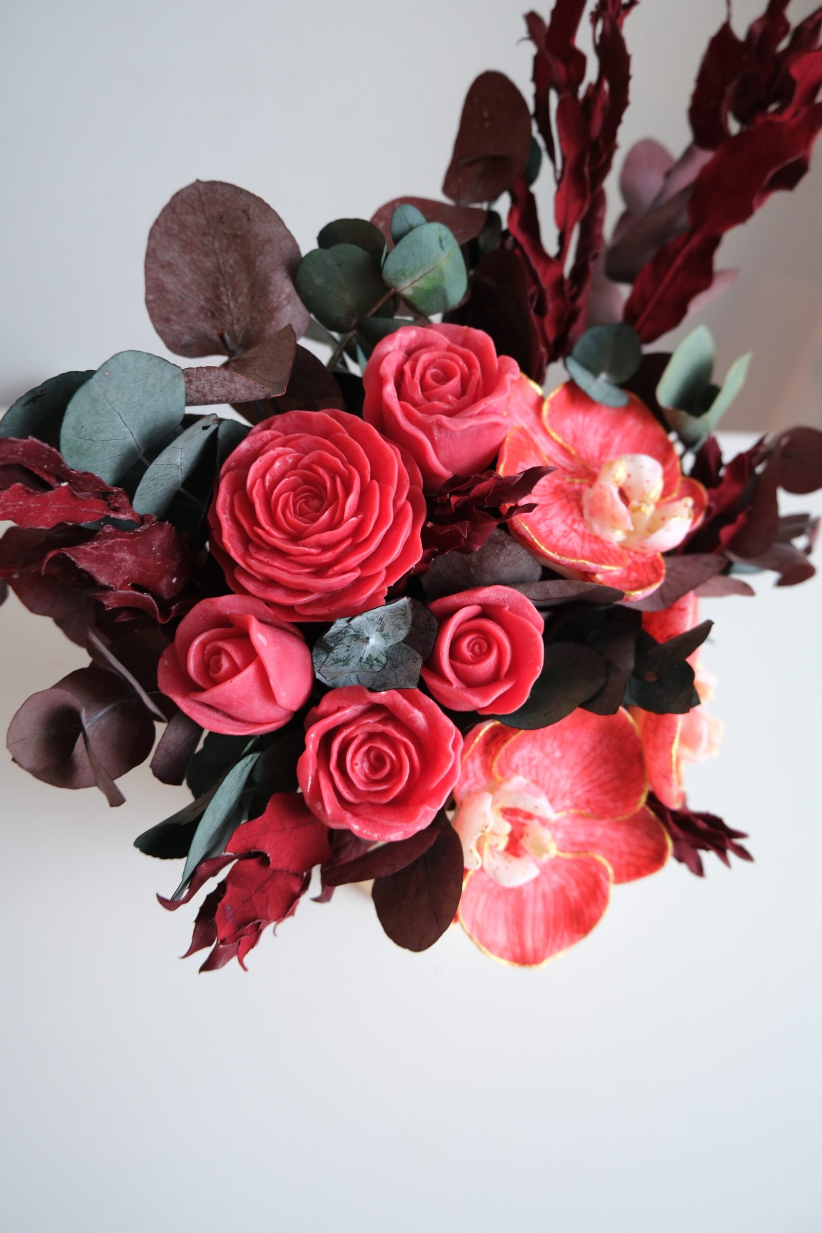Skład: naturalny wosk sojowy, dekoracyjne świece, ręcznie malowane storczyki, stabilizowany eukaliptus, stabilizowane trawy
