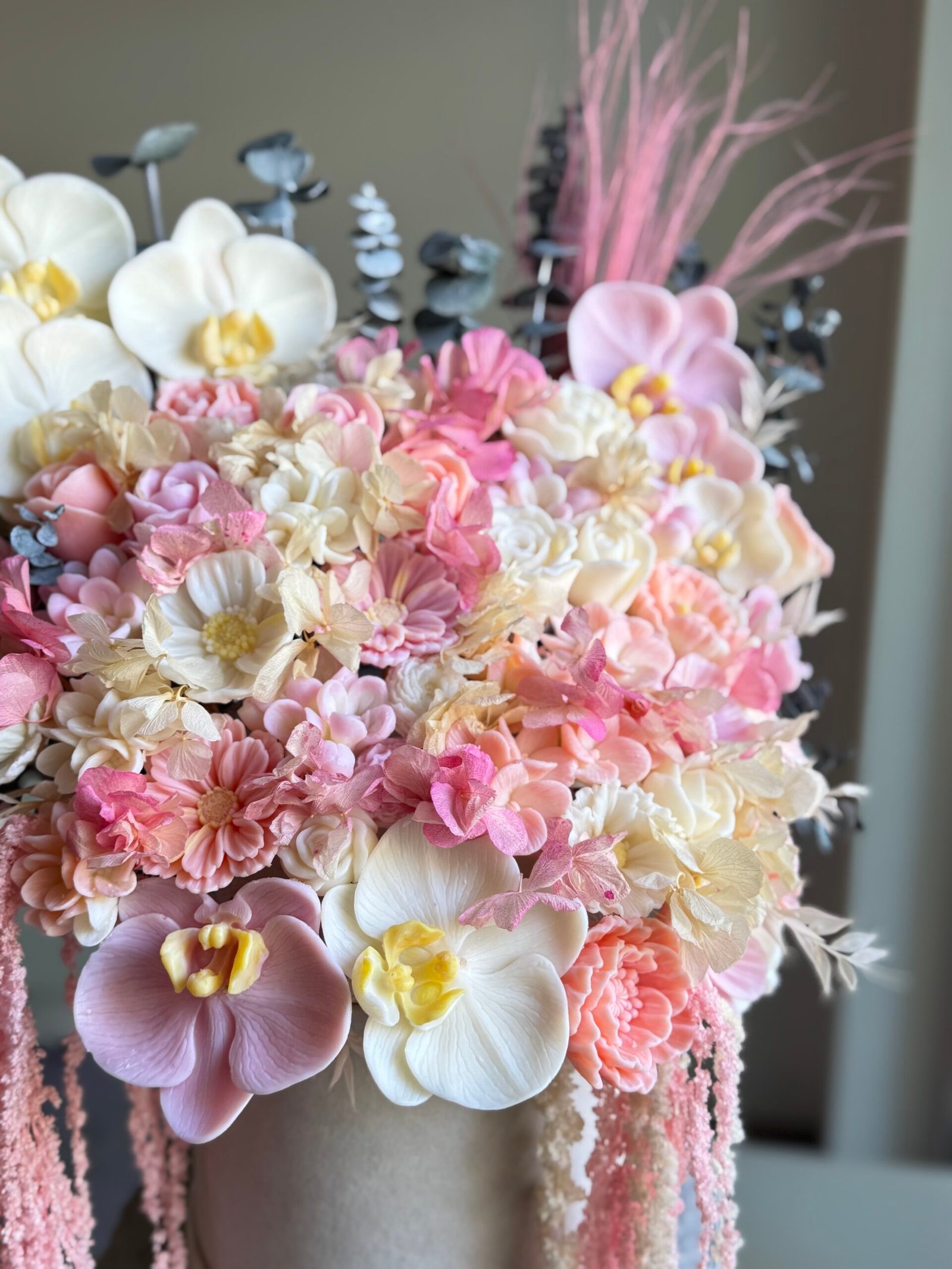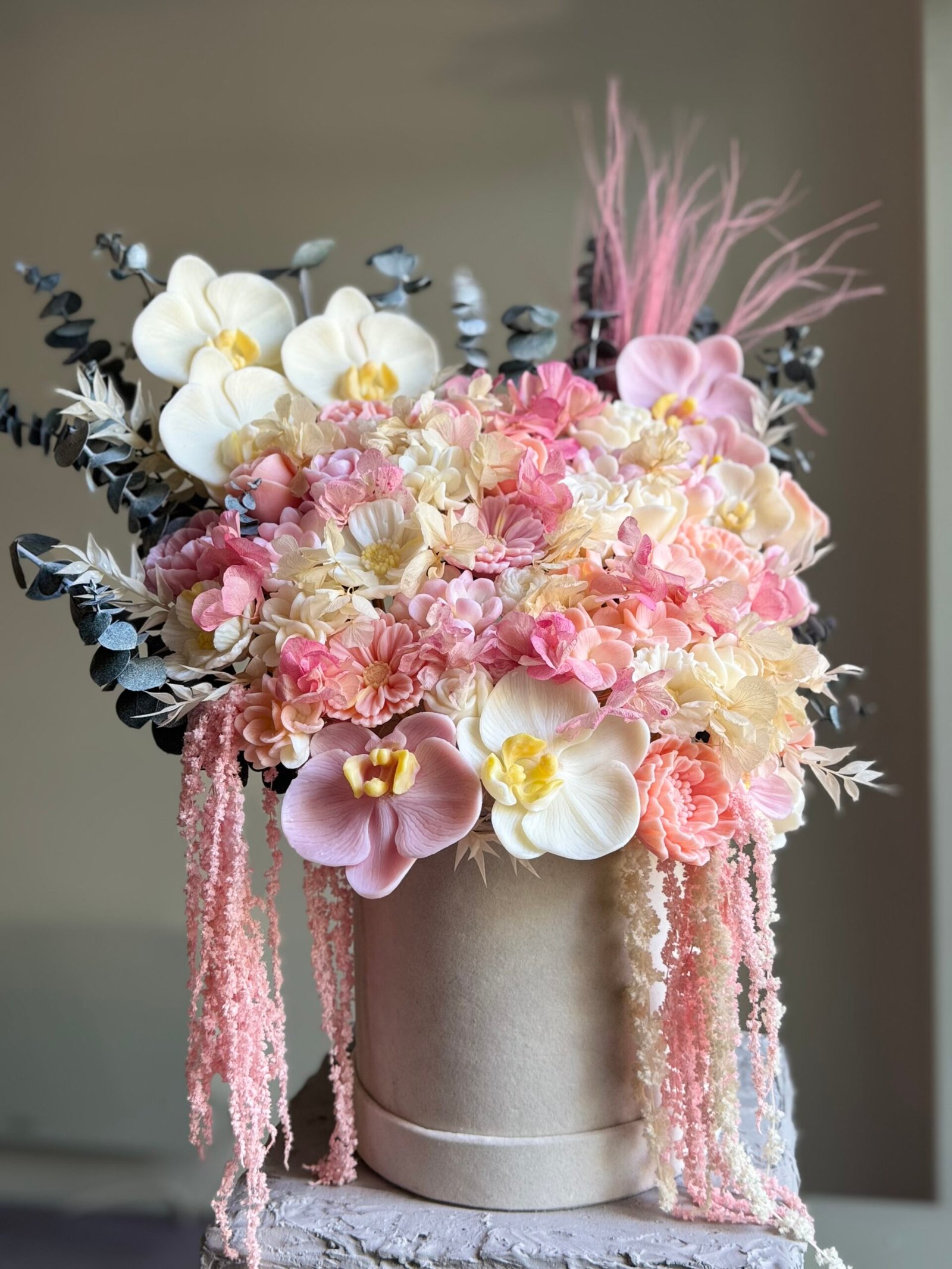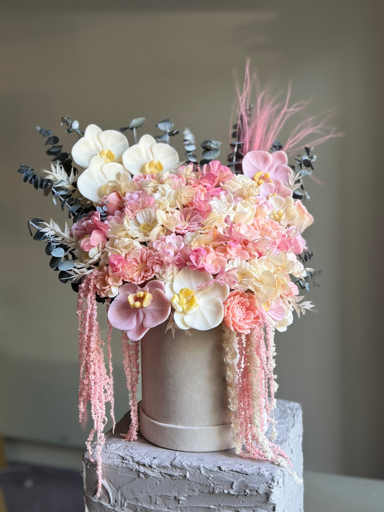 Taki flower box urodzinowy będzie idealnym prezentem na wyjątkowe okazje – urodziny, rocznicę, ślub, jubileusz czy podziękowania. Może również stać się niepowtarzalną dekoracją salonu, biura, witryny sklepowej czy przestrzeni eventowej. Dzięki subtelnej kolorystyce w odcieniach różu, beżu i bieli kompozycja dodaje elegancji i ciepła każdemu wnętrzu.