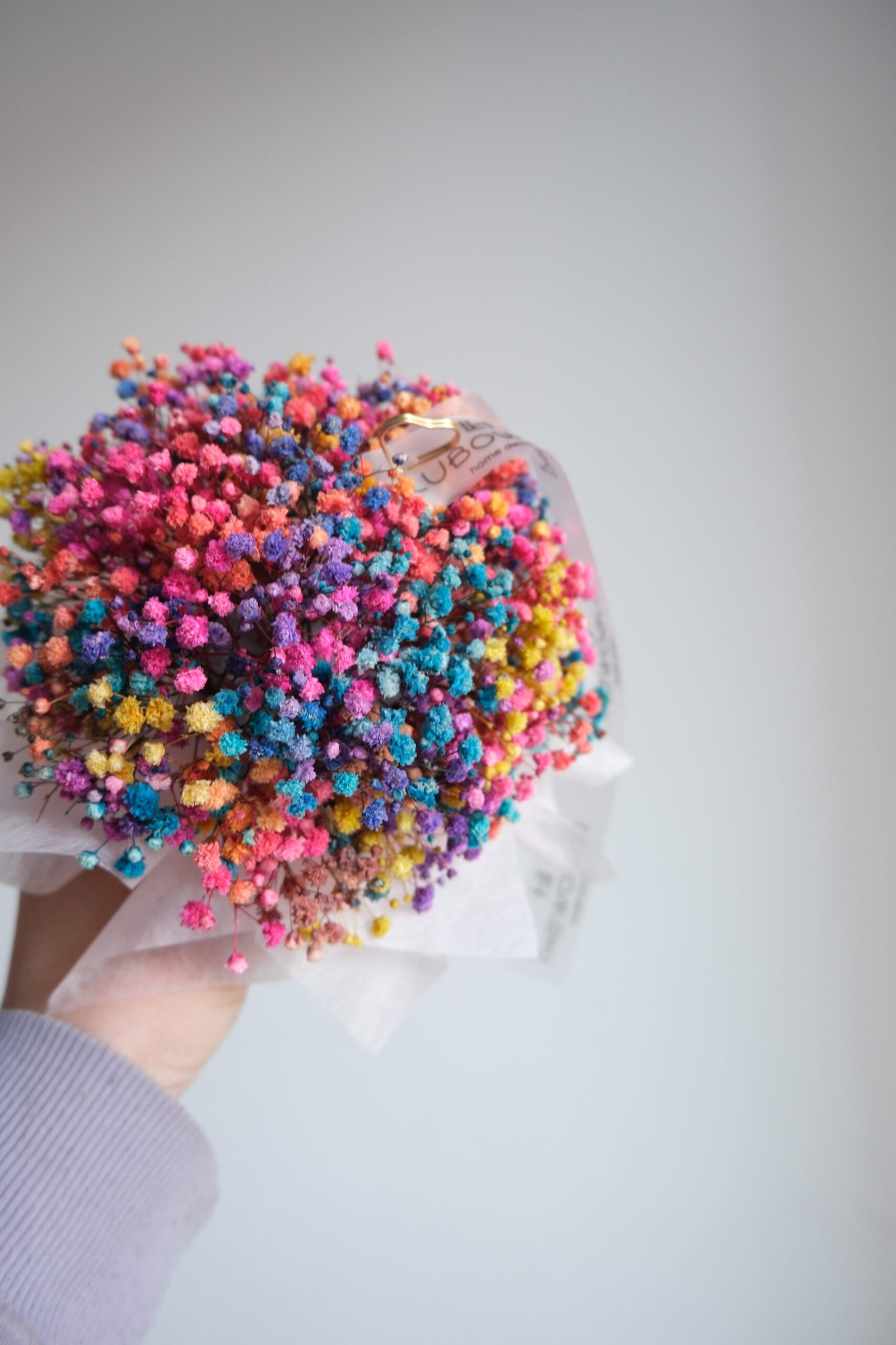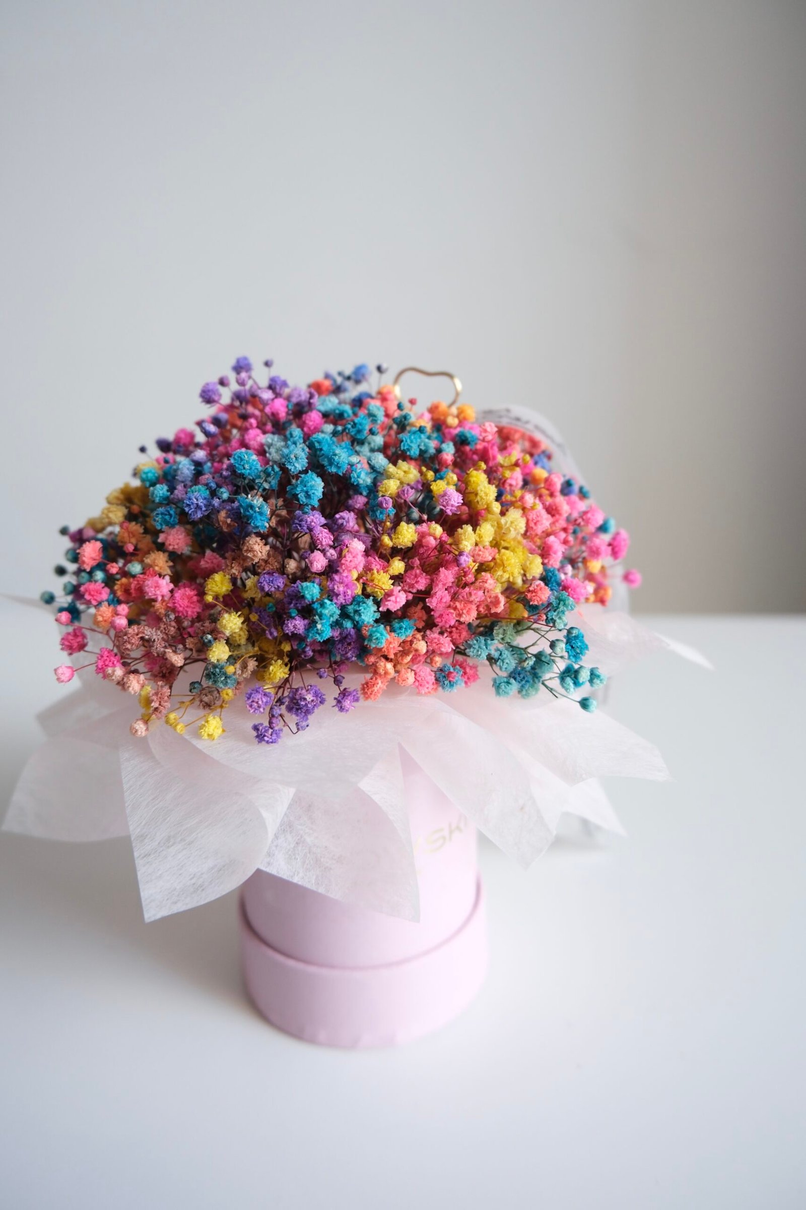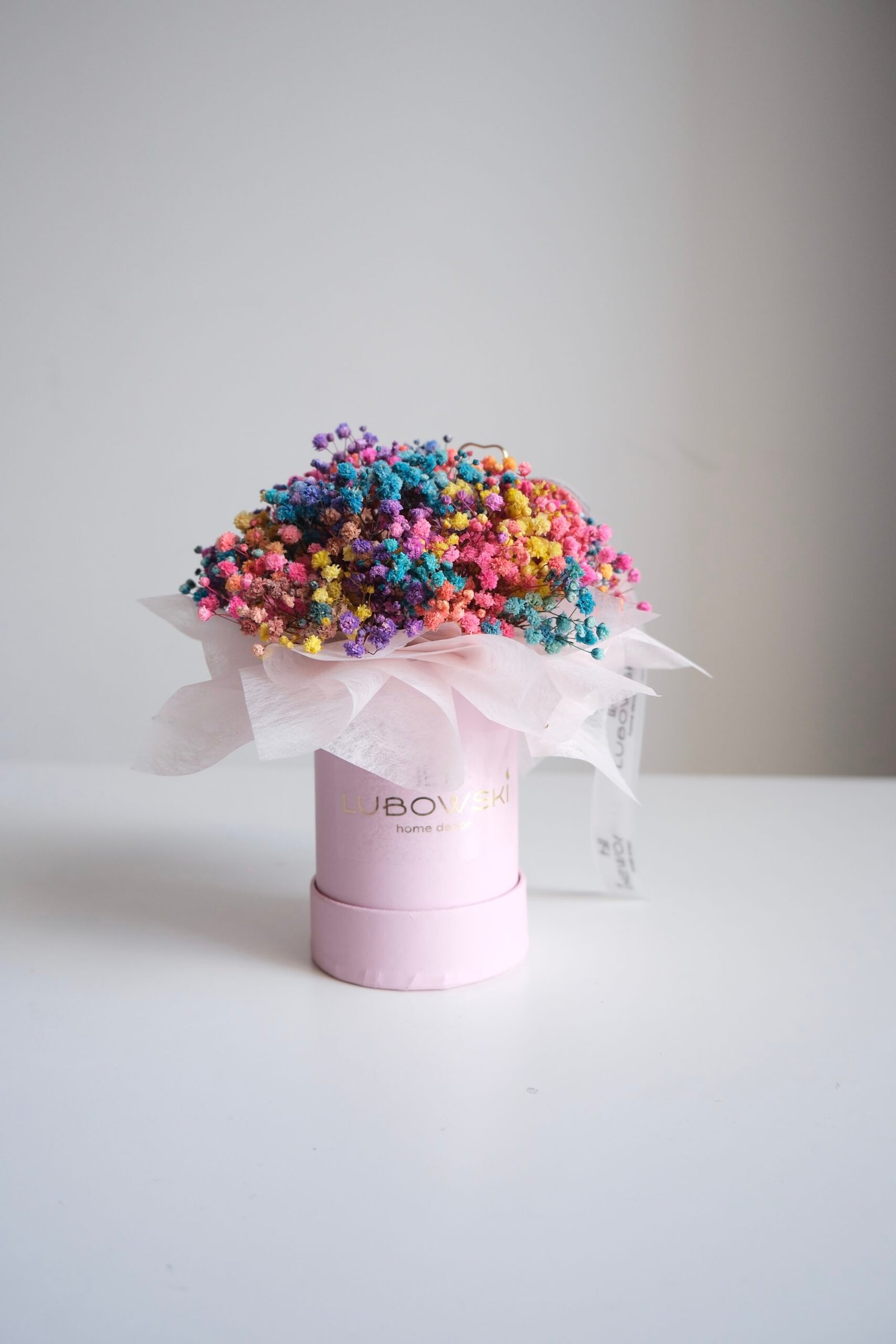 Kolorowa kompozycja z gipsówki doskonale sprawdzi się jako wyjątkowy prezent. Dzięki swojej trwałości pozostaje piękną pamiątką na długo.