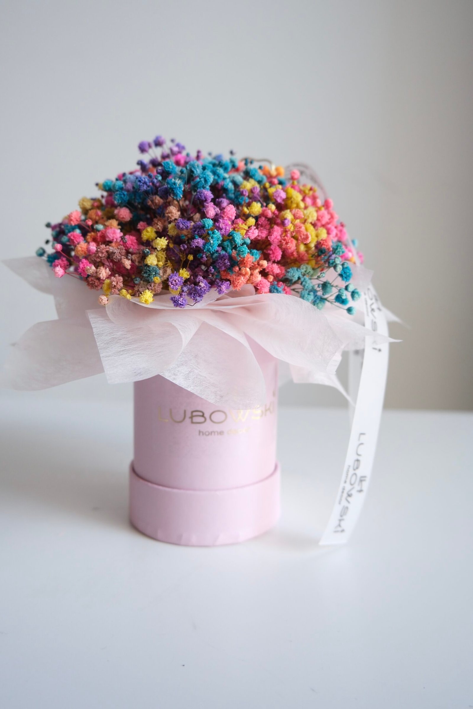 Flower box z gipsówką stabilizowaną to wyjątkowa dekoracja, która łączy naturalne piękno kwiatów z elegancką formą kompozycji. Drobne kwiaty gipsówki tworzą lekką i delikatną strukturę przypominającą kolorową chmurę, dlatego całość prezentuje się niezwykle subtelnie i stylowo.