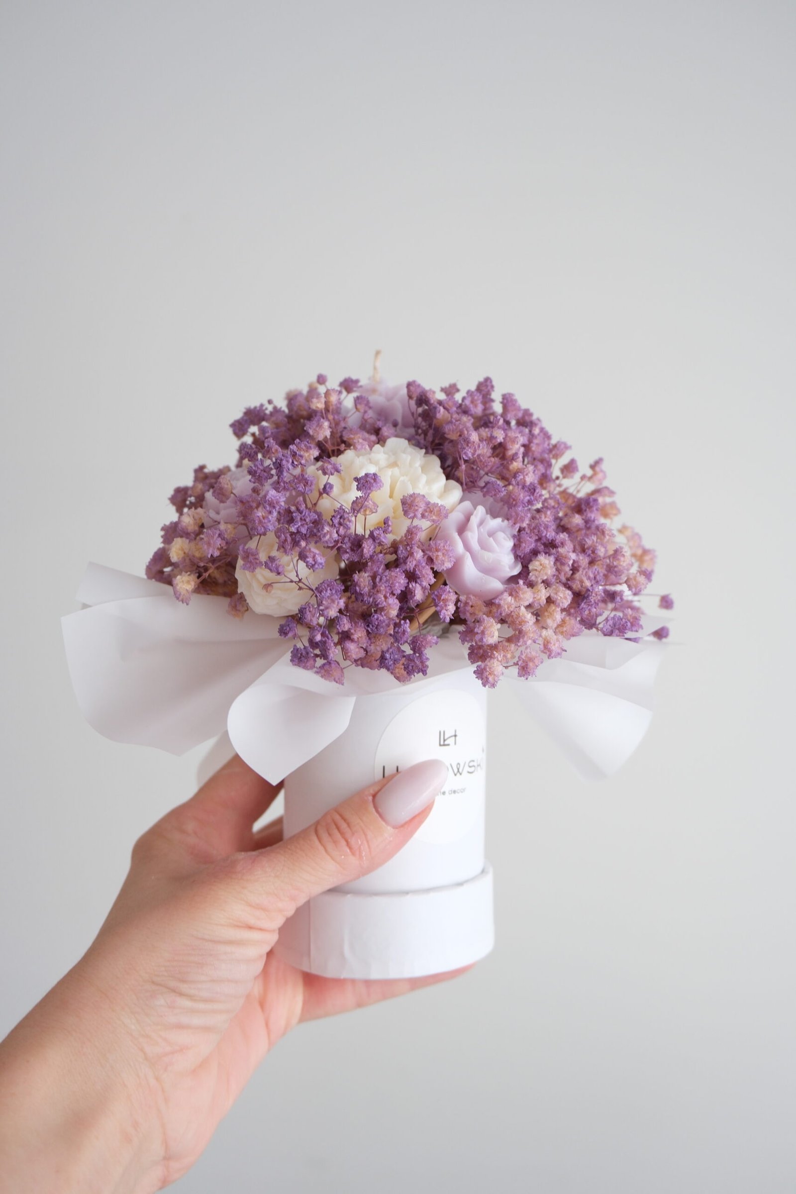 Każdy Candle Flower Box powstaje ręcznie, dlatego każdy egzemplarz jest jedyny w swoim rodzaju. Delikatne różnice w ułożeniu świec i detali podkreślają charakter rękodzieła. W kompozycjach wykorzystujemy stabilizowaną gipsówkę, która zachowuje swój naturalny wygląd przez długi czas i nie wymaga żadnej pielęgnacji.