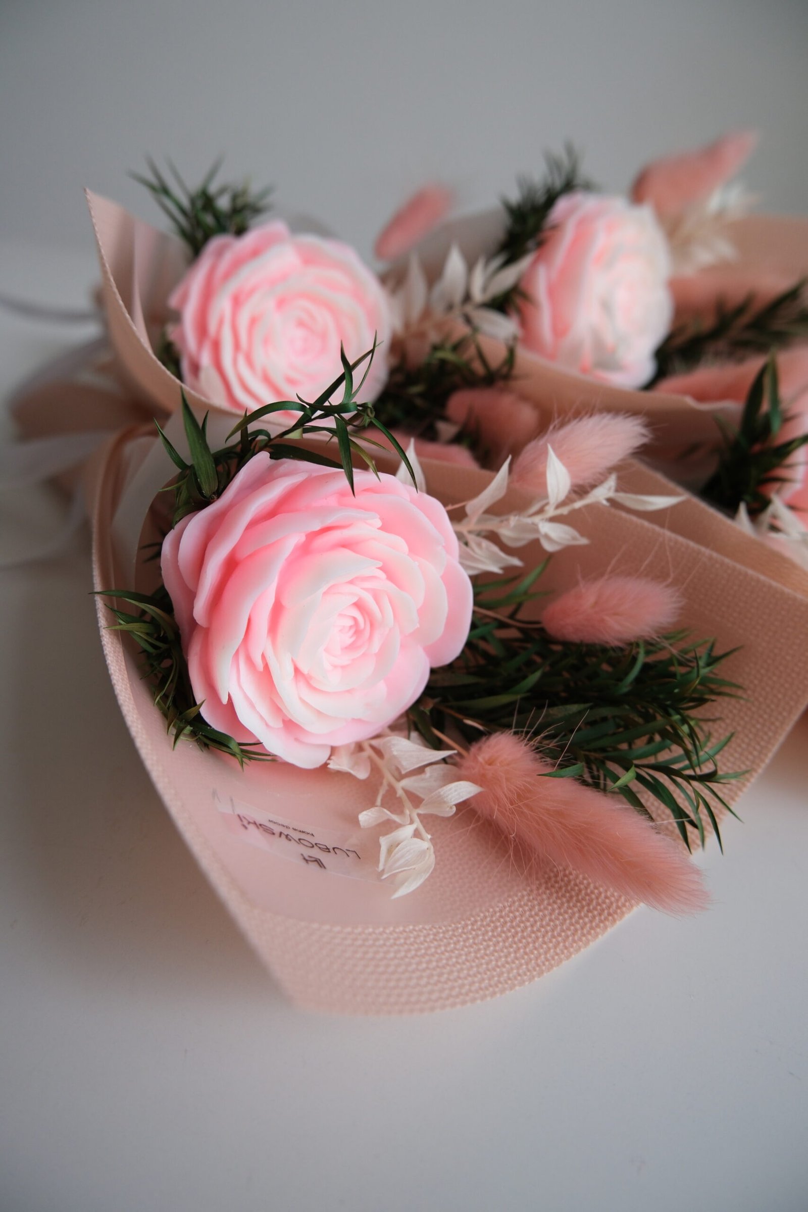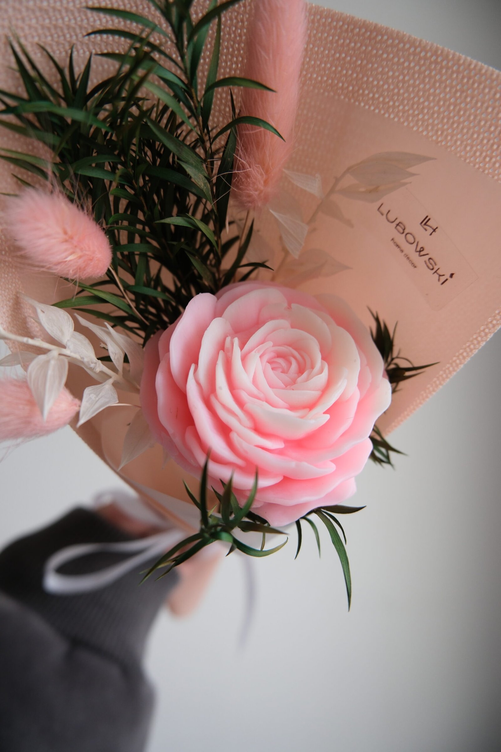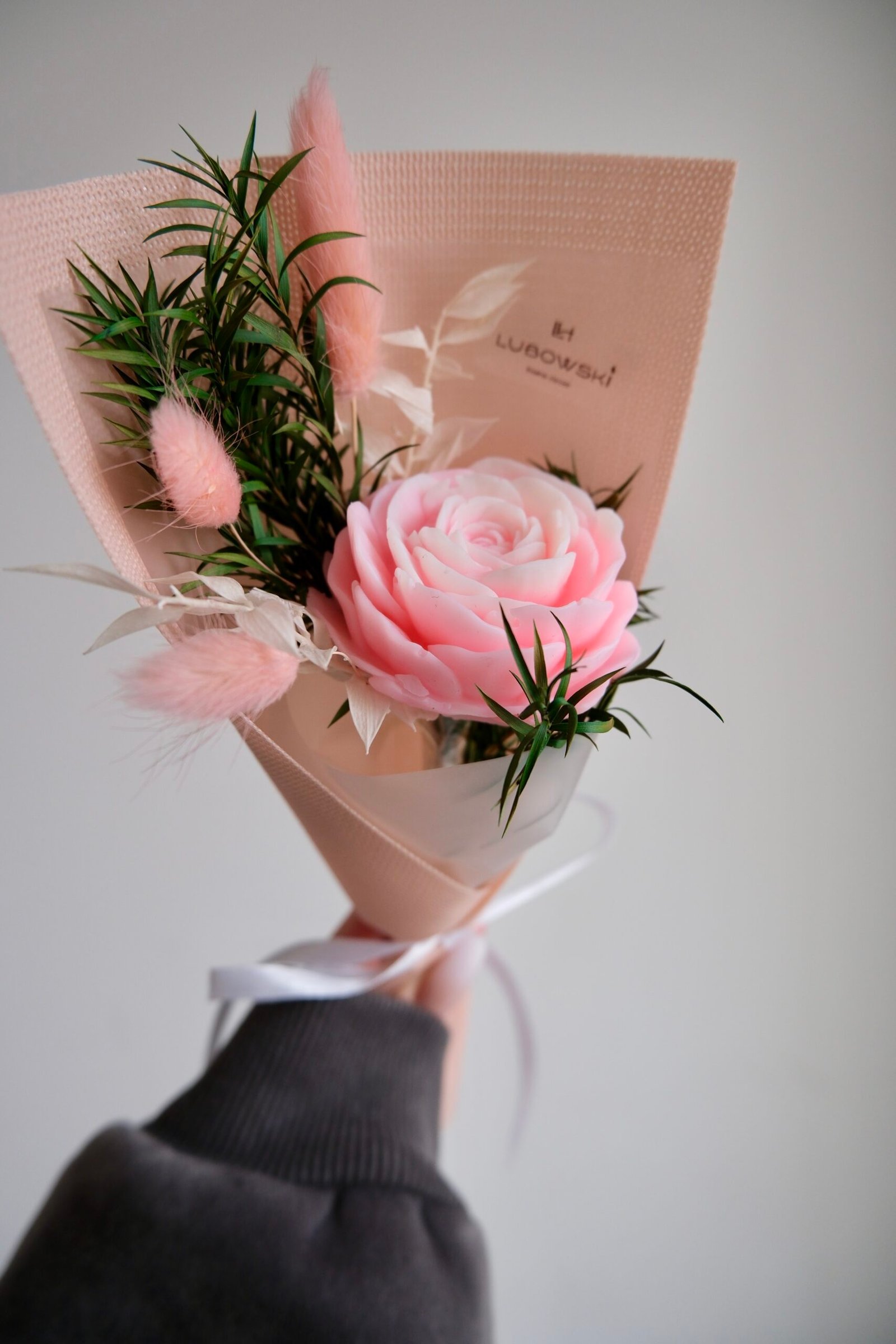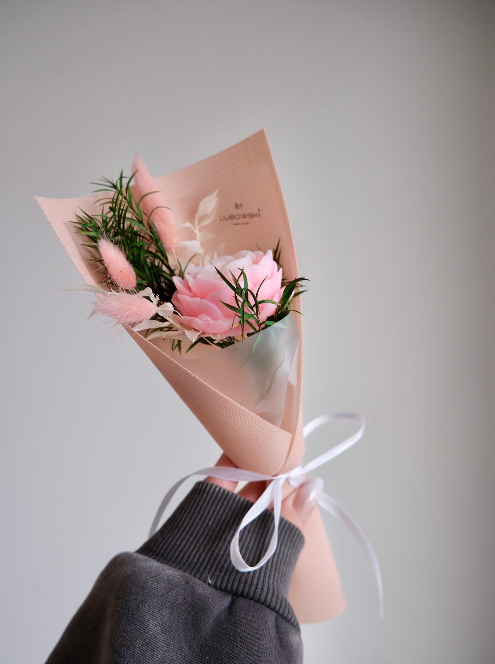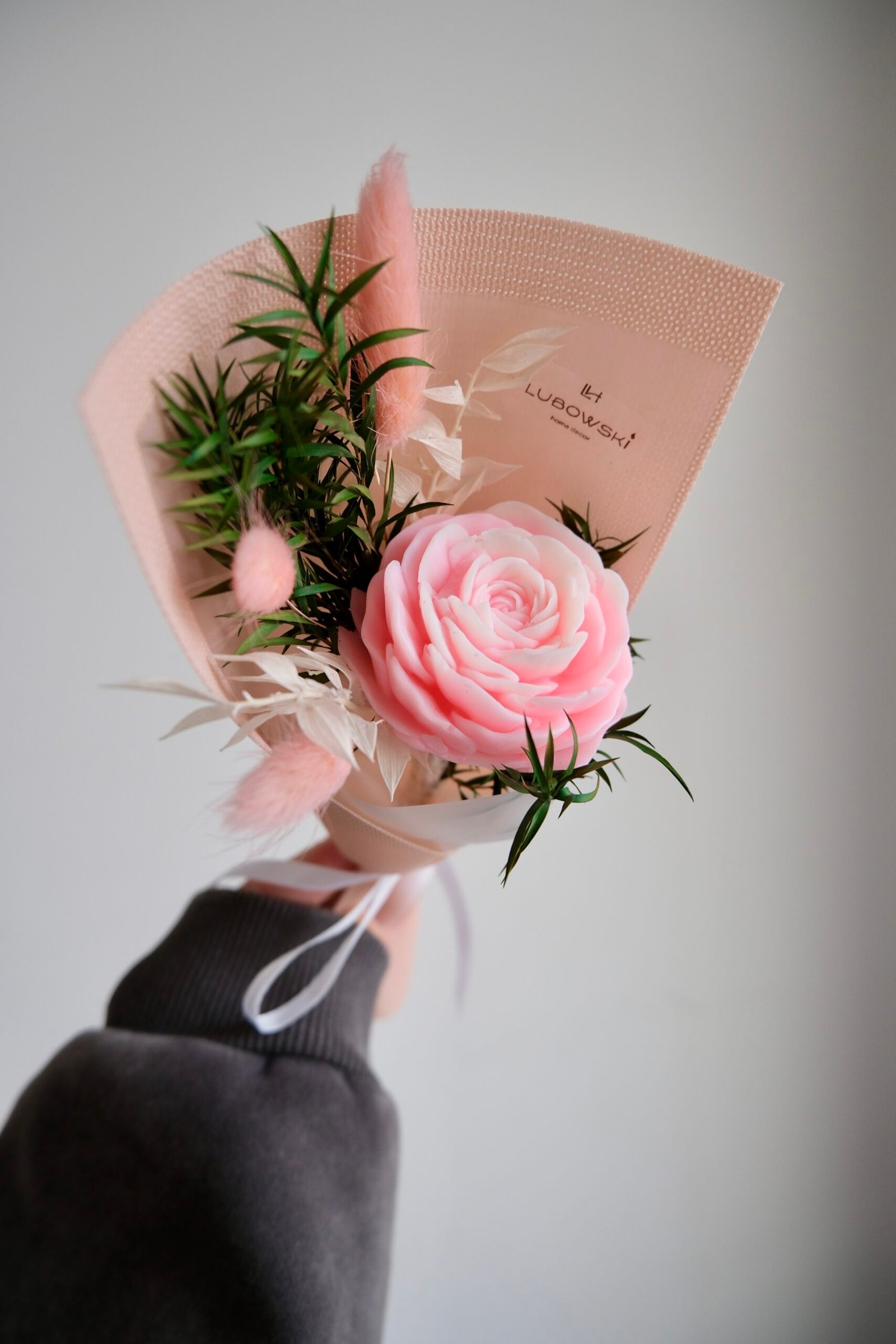 W centrum bukietu znajduje się kwiat o średnicy około 6 cm, który tworzymy ręcznie z naturalnego wosku sojowego. Cała kompozycja ma około 26–27 cm długości, dlatego prezentuje się lekko i proporcjonalnie. Starannie dobieramy dodatki florystyczne oraz eleganckie, minimalistyczne opakowanie w formie stożka, aby całość wyglądała estetycznie i nowocześnie.