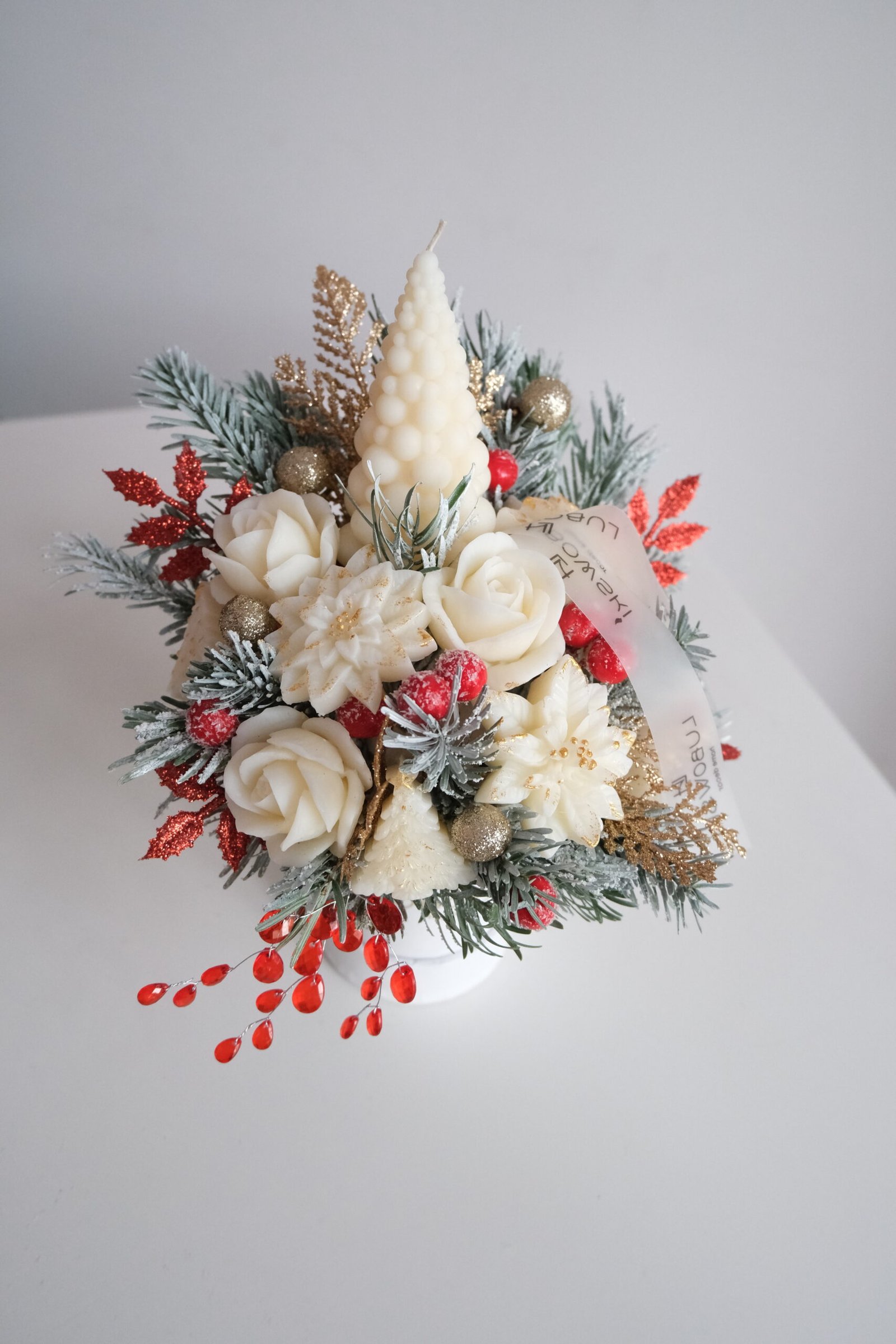 Świąteczny ozdobny box to pełna klasy dekoracja, która wnosi do wnętrza magię zimowych dni. Każdy element tworzymy ręcznie z naturalnego wosku sojowego, dlatego kompozycja zachwyca blaskiem, subtelnym aromatem oraz dopracowanymi detalami. Kremowe świece w kształcie choinek i kwiatów, połączone z czerwonymi akcentami oraz gałązkami jodły, tworzą spójną i elegancką całość. To wyjątkowy prezent na święta, który łączy piękno natury z artystycznym rzemiosłem i świątecznym klimatem.